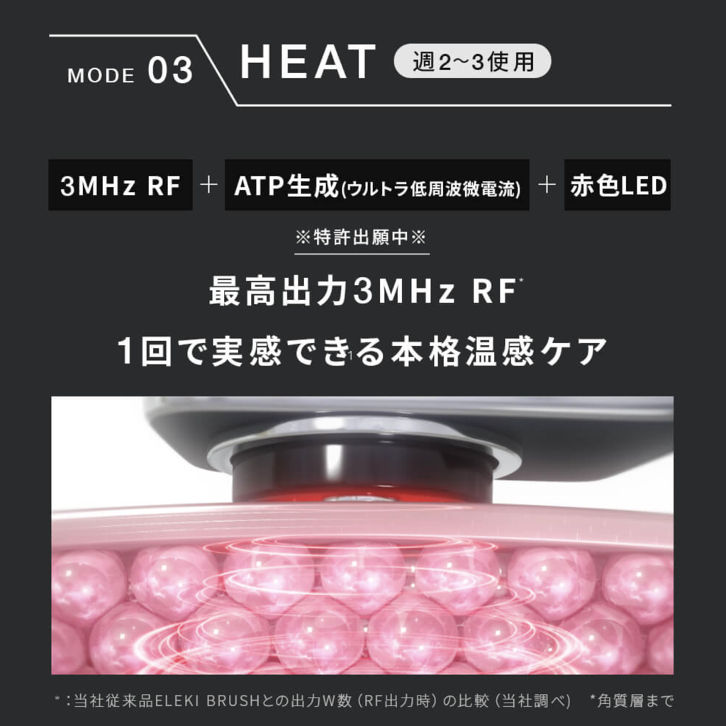 ヒートモードでは、「3MHz RF(ラジオ波)」で肌を深層から温めながら、「ATP生成(ウルトラ低周波微電流)」+「赤色LED」によって、さらに本格的な温感ケアができます。(※特許出願中)